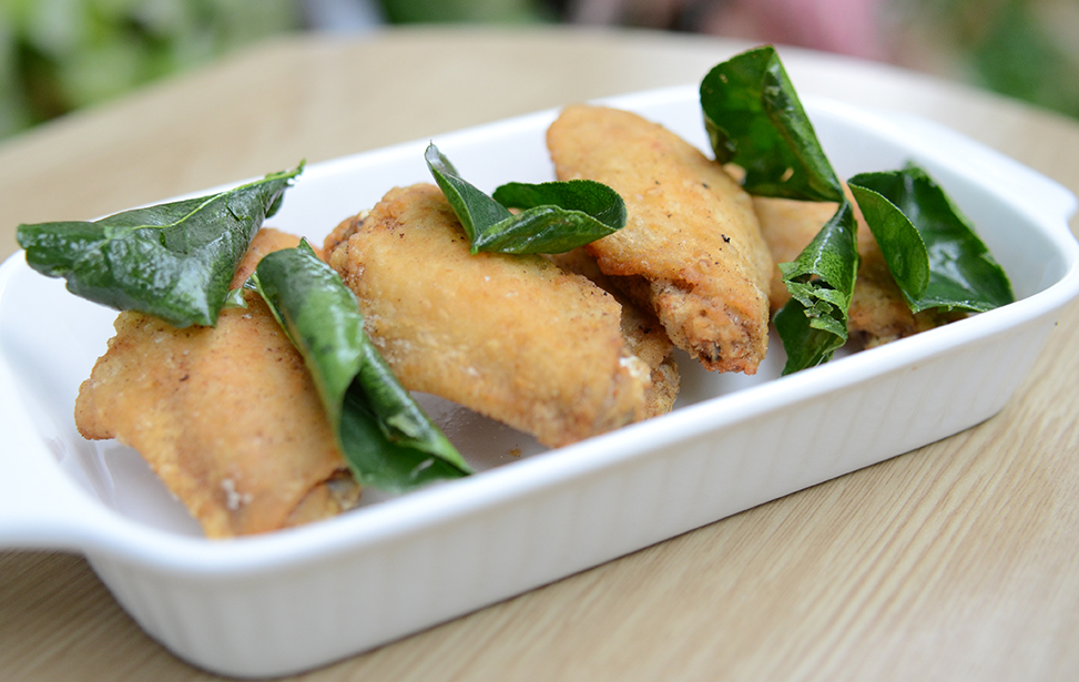 NewDeep-fried chicken wings with herbs - Deep fried chicken wings till they are a crisp on chicken skin and soft on chicken meat; dip with chicken chili sauce.