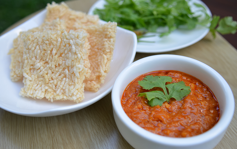 Rice crackers with dried chili dipping sauce- Deep fried rice cracker till they are golden brown; serve with dried chili dipping sauce.