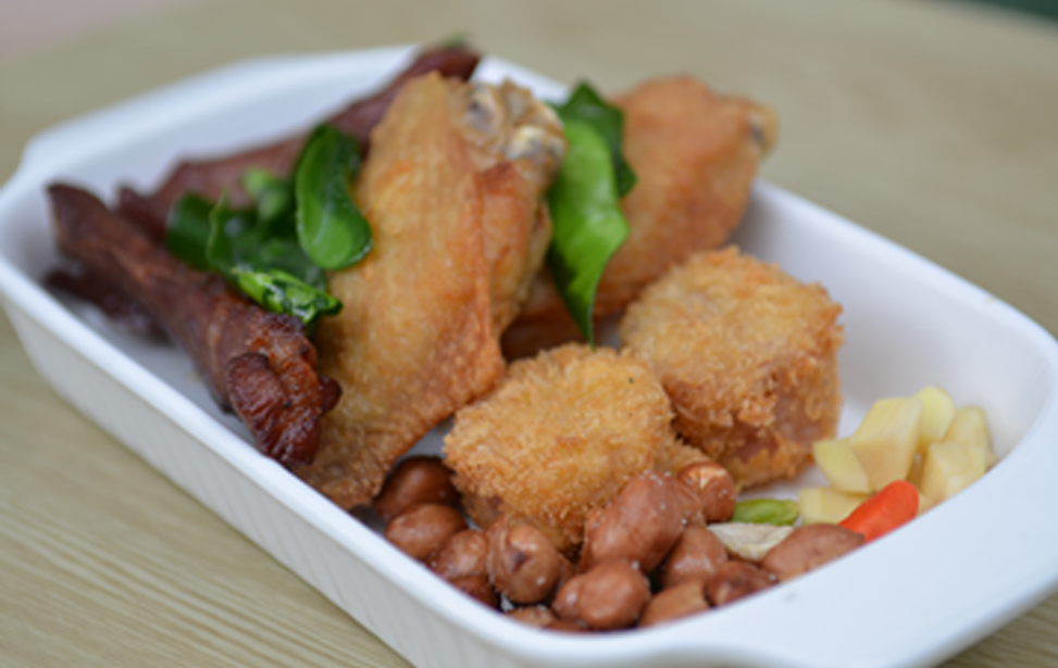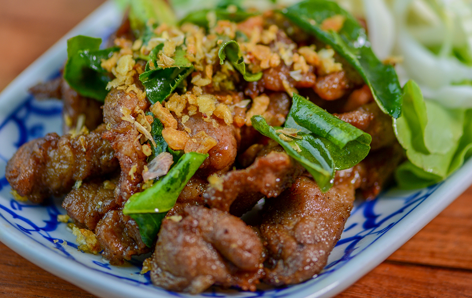 This plate is a combination of deep-fried fermented Isan pork sausage, chicken wings with herbs and pork neck/shoulder with herbs.
