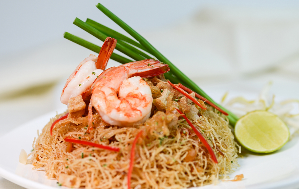 Herbed crispy dried rice vermicelli - Fried rice vermicelli till it is golden brown; mix them with sweet and yummy sauce; serve with bean sprout, citrus skin, marinated garlic and tiger prawns .