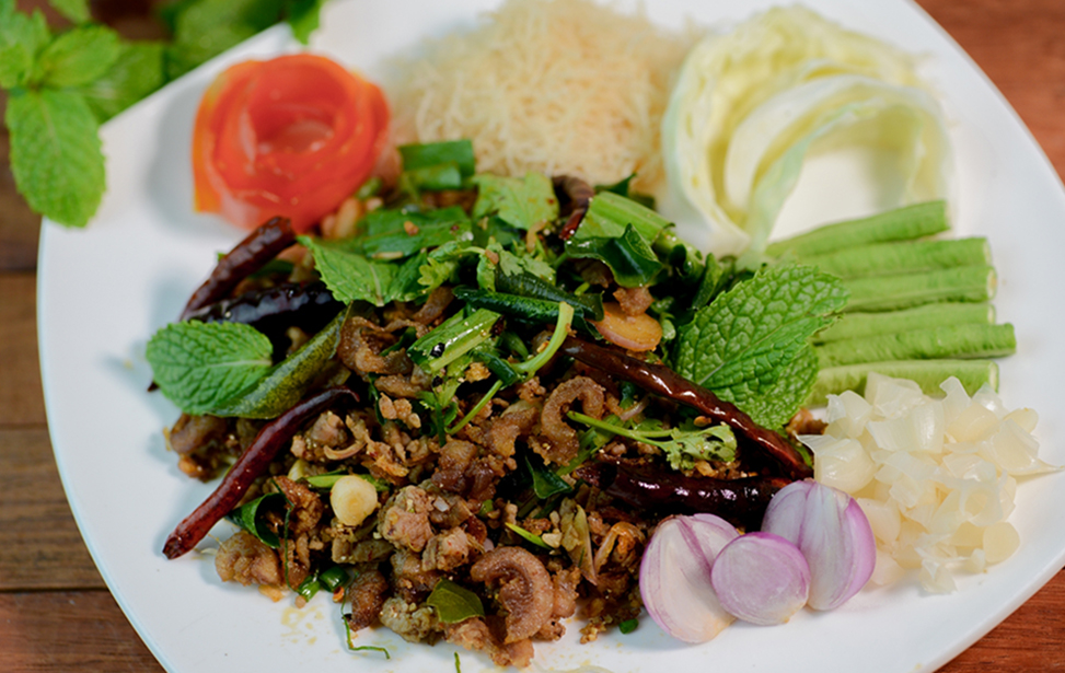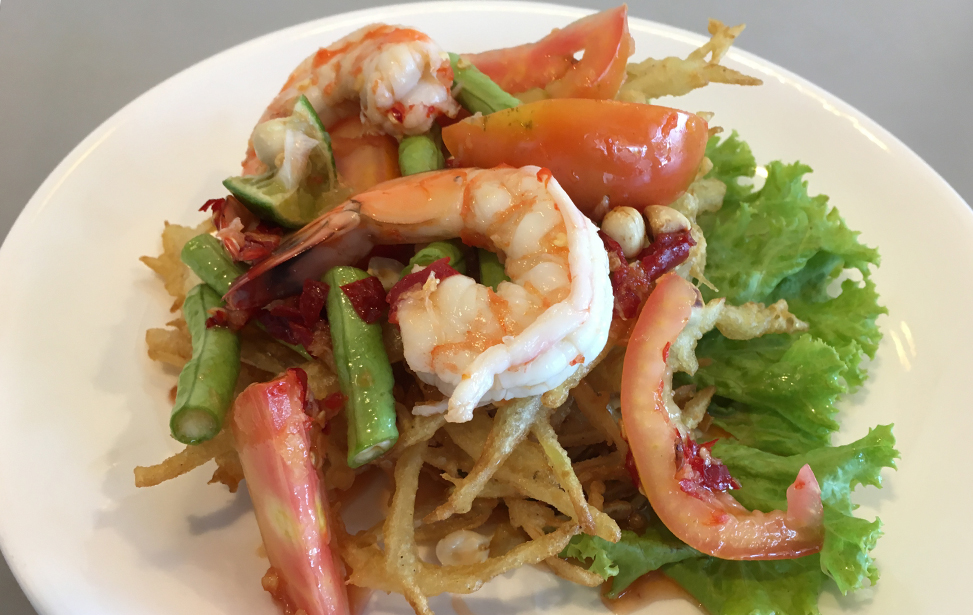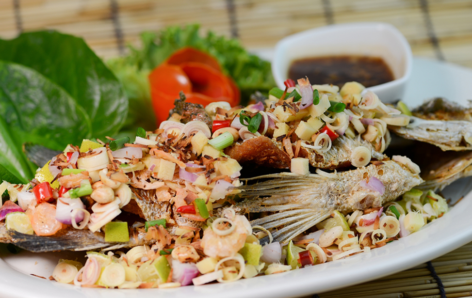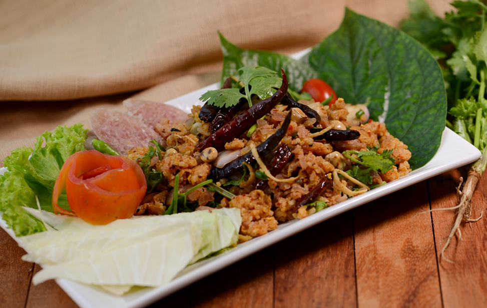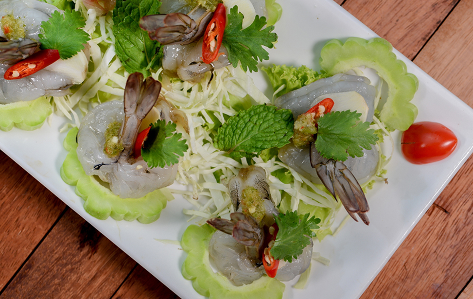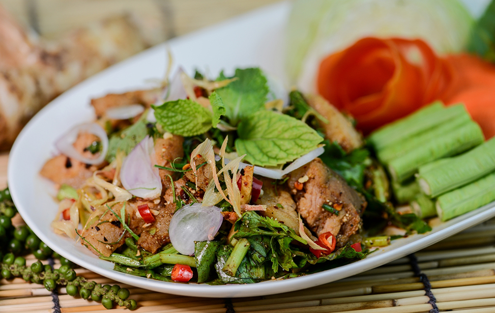 Grilled marinated pork or tiger prawns till perfection mixed with spicy Thai herb sauce served with mixed of vegetable.