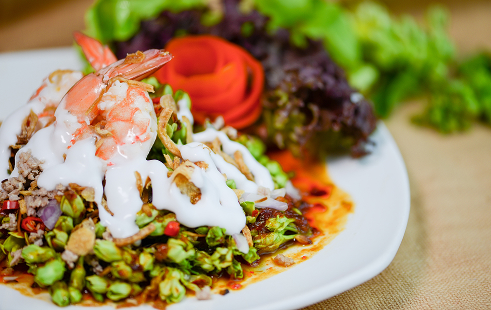 Cowslip creeper (a kind of Thai flower) in spicy plum sauce with tiger prawns.