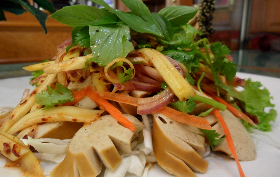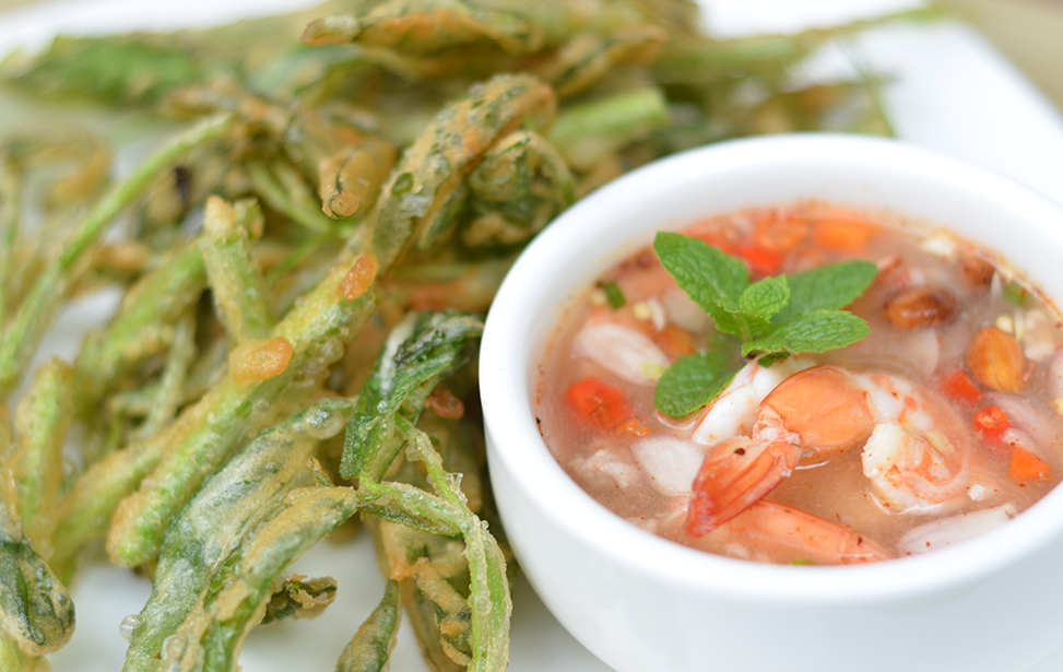Crispy morning glory; dipped with sweet and sour tiger prawns sauce.