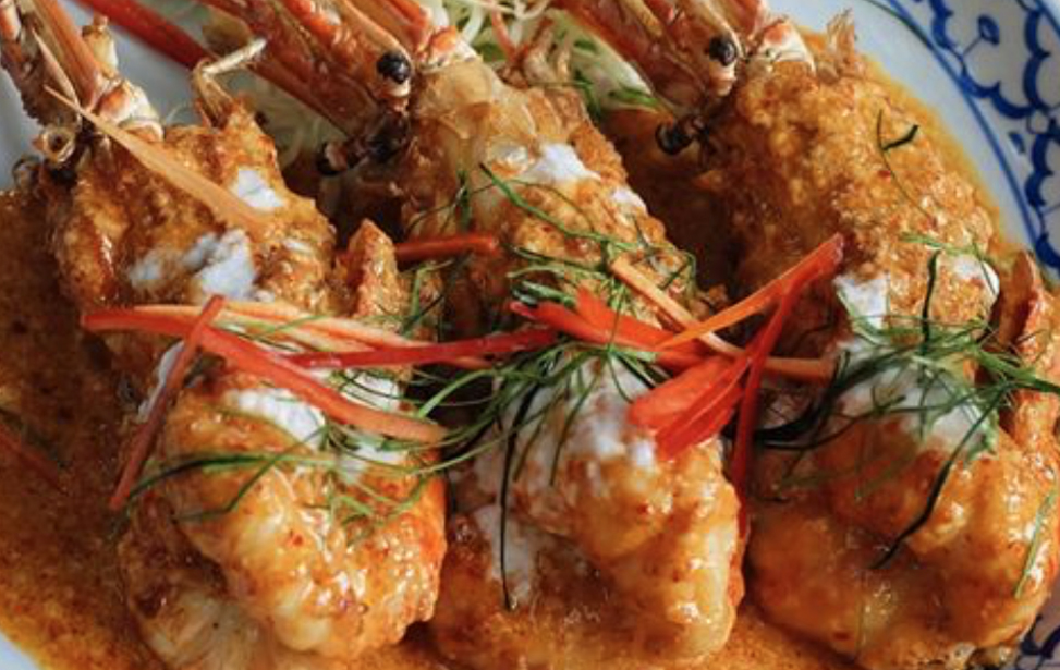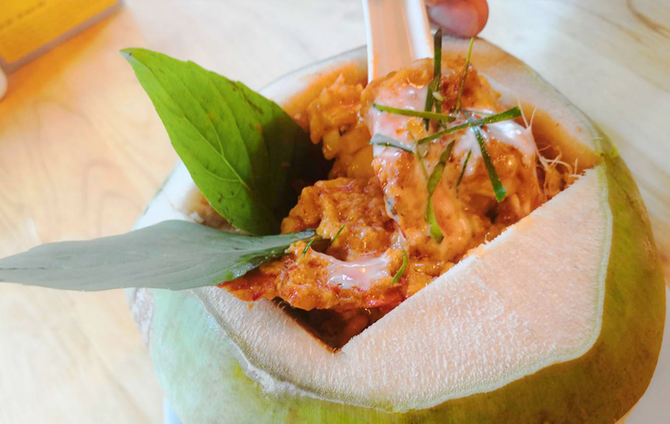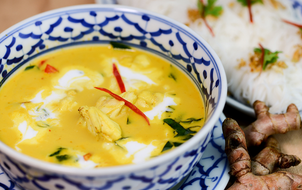 NewHuge crab meat in yellow curry (Phuket style) served with rice vermicelli.