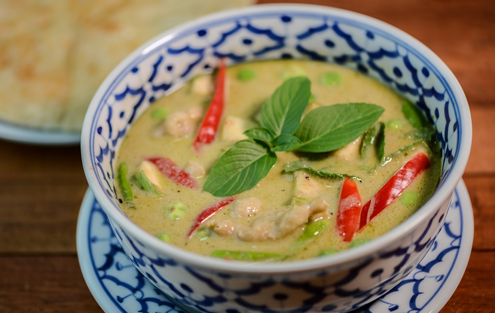 Your selection of meat (pork, chicken, sirloin, clown featherback ball or minced stuffed calamari) in green curry served with Roti plate. (180.- บาท สำหรับ หมู หรือ ไก่ / 200.- บาท สำหรับ เนื้อ ปลากราย หรือ ปลาหมีกยัดไส้)