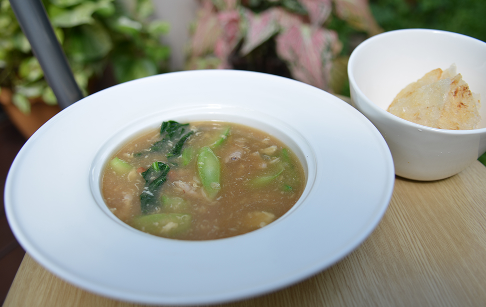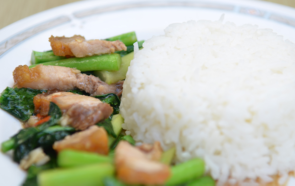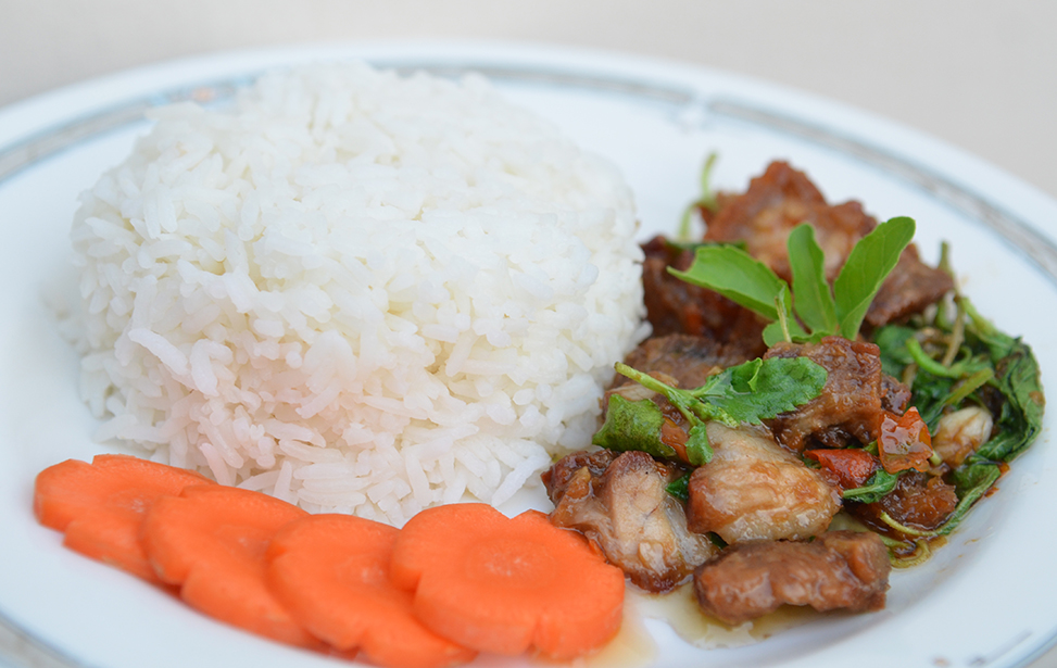 Stir-fried your selection of meat (crispy pork, chicken, minced pork, seafood or minced sirloin) with basil and soy sauce served with steamed or brown rice. (80 บาท สำหรับ หมูกรอบ ไก่ และ หมูสับ / 110 บาท สำหรับ ทะเล และ เนื้อสับ)