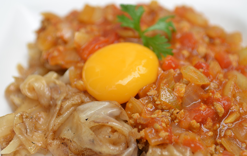 Stir fried fresh flat rice noodle with our secret tomato sauce with your selection between mince pork or sirloin; topped with egg yolk – This is a Thai authentic dish. (90 บาท สำหรับ หมูสับ / 100 บาท สำหรับ เนื้อสับ)