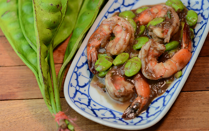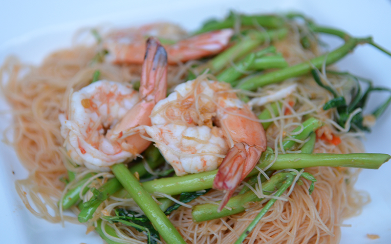 ● เส้นหมี่ผัดผักกระเฉด กุ้งสด