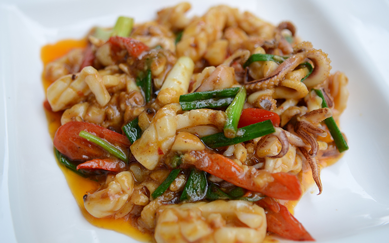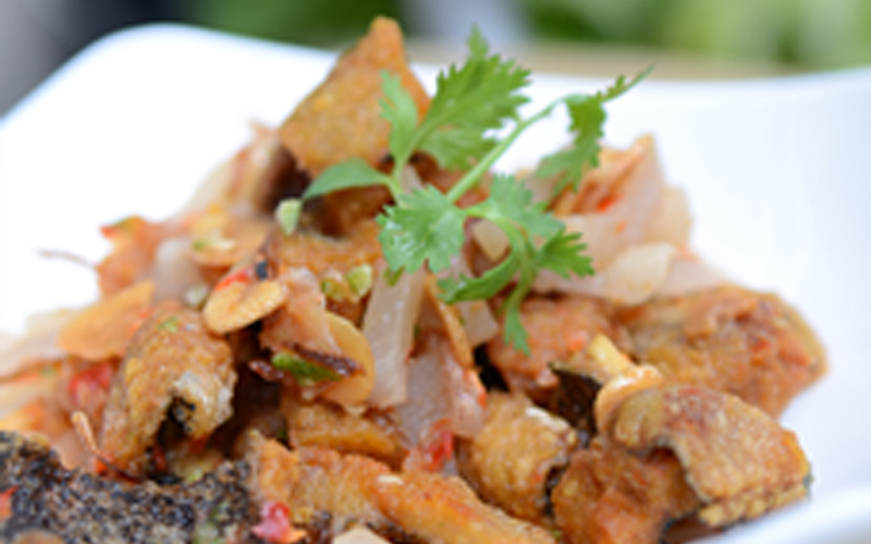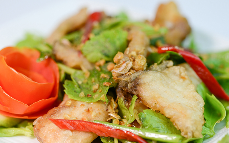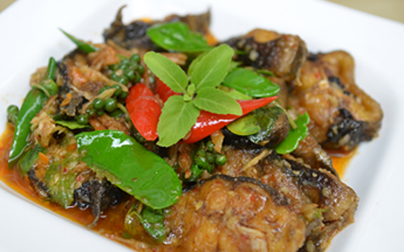 ● ปลาดุกทอดกรอบผัดเผ็ด สมุนไพร