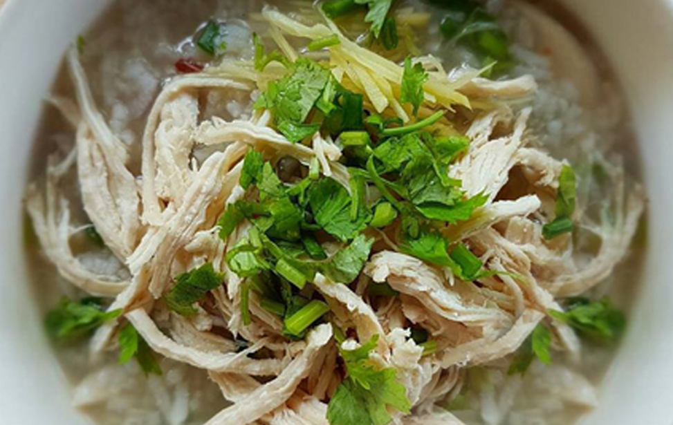 HotShreded chicken in rice soup.