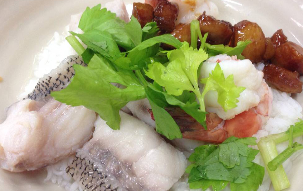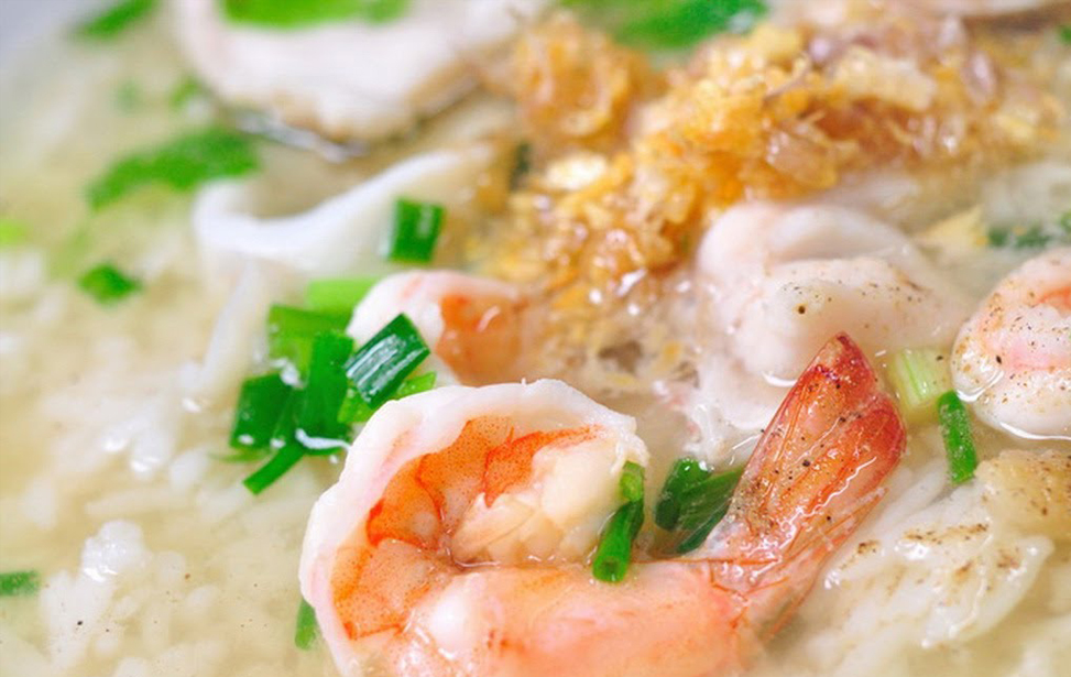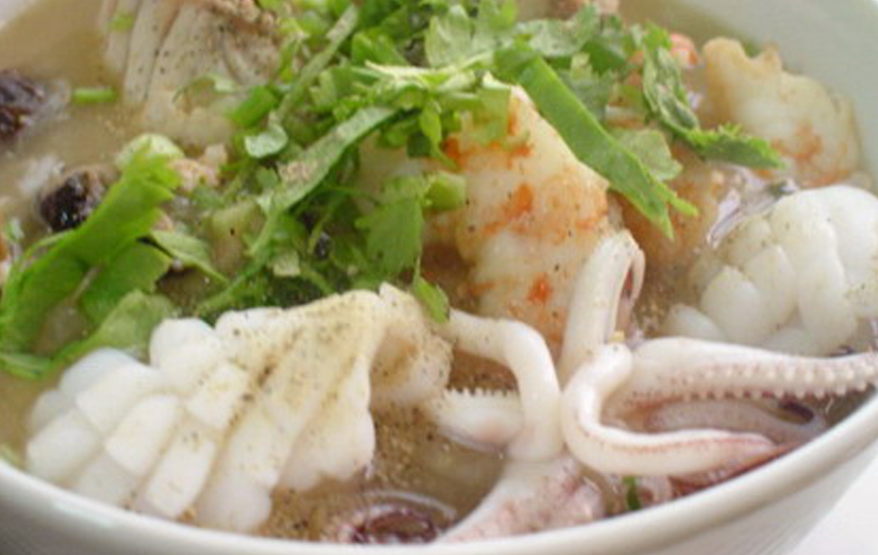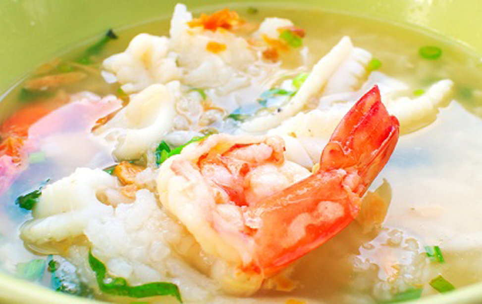 Tiger prawn, snapper and squid in rice soup.