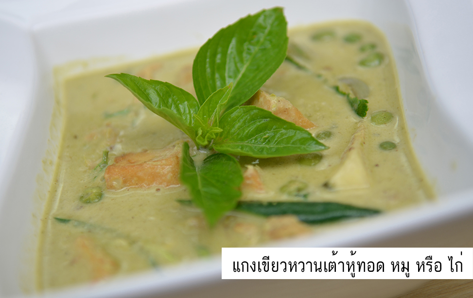 - แกงเขียวหวานเต้าหู้ทอด, หมู หรือ ไก่